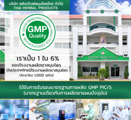บริษัท ผลิตภัณฑ์สมุนไพรไทย จำกัด (Thai Herbal Products Co., Ltd.) เป็น 1 ใน 6% ของโรงงานผลิตยาสมุนไพรในประเทศไทย ที่ได้รับการรับรองมาตรฐานการผลิต GMP PIC/S ซึ่งเป็นมาตรฐานเดียวกับการผลิตยาแผนปัจจุบัน เรายึดมั่นในการพัฒนาและควบคุมคุณภาพในทุกขั้นตอน เพื่อส่งมอบผลิตภัณฑ์สมุนไพรที่ได้มาตรฐานสากล